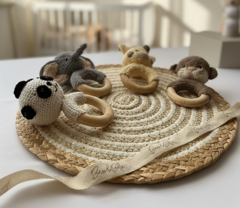 Cada artículo de Bambibella está hecho con materiales suaves y seguros, diseñados para brindar confort y alegría a los bebés, desde cobijas hasta sonajas y nidos portátiles.